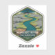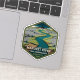 A hexagonal vintage travel badge inspired by the Manuxet River and its tidal marshlands near Innsmouth, depicting a calm aerial view of coastal wetlands leading toward the sea.