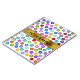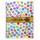 This notebook design features lots of circles/dots of various colours. It also features a custom name within a faux gold coloured area.