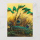 Many different kinds of feathers on a yellow postcard