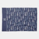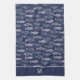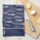 A pattern of white and light blue line fish drawings on a navy blue background makes this kitchen towel unique! The images are placed on a dark blue background, and a matching border at the bottom holds your monogram or other text.