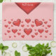 Destei's red hearts in different sizes on a blush pink background colour. There is also a personalizable text area on the big heart in the middle.