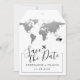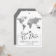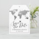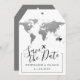 A luggage tag shaped destination wedding save the date with a faux silver foil world map with an editable heart location marker and romantic aeroplane icon. Select your own background colour on the back side of the tag card to coordinate with your travel theme wedding colours.