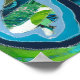 Patchwork style map of Aotearoa New Zealand, in blues and earthy tones. Created in textile art with upcycled materials.
