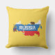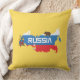 Golden yellow background. Russian flag with the white blue and red striped flag shown within. A Russian bear at top and a representation of a Russian Orthodox church