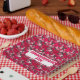 Red and white maple leaves on a charcoal background. (Pink background is also available).