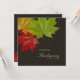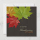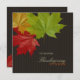 Modern and elegant Thanksgiving dinner / party invitation template with colourful autumn theme featuring beautiful red, orange and green maple leaves on chocolate brown background.