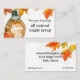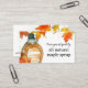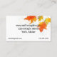 A business card to advertise selling maple syrup decorated with a glass syrup bottle and bordered with colourful maple leaves and accented with watercolor spatter spots on a white background with black text that you can edit to fit your needs.