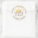 Simple and Elegant Round White Maple Syrup Label with the words "Maple Syrup" in a metallic gold text. Business name and location in embossed text. Dashed line border in gold. Editable form field for Grade of Maple Syrup and net weight. Yellow autumn sugar maple leaf tinged with orange.