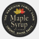 Round Black Maple Syrup Label with the words "Maple Syrup" in an embossed metallic gold font. Dashed line border in gold. Metallic yellow-gold and red sugar maple leaves.