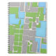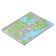 A bird's eye view of a city with various shapes and a colour scheme of grey, green and blue.