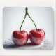 A pair of shiny red cherries with their stems intertwined resting on a white doily with intricate lace patterns