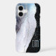 This pretty phone case features a blue, gray, and silver faux glitter abstract agate like pattern on the left side, and your monogram in matching silver against a black background on the right. An overlay of tiny silver and blue confetti adds interest and sparkle. Unique and elegant!