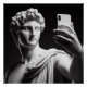 A white marble bust of an ancient Greek man taking selfie with his mobile phone