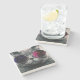 The coasters are gorgeous, a quality feel and heavy weight. They look like a precious archeological find. A rustic stone juxtaposed with a modern floral black and white print. I like the way the print goes slightly imperfect on the cut stone edges giving them a kind-of natural beauty.