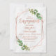 Modern geometric design engagement invitation in faux rose gold with a marble image background and two watercolor foliage or greenery arrangements.