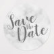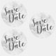featuring title "Save the Date" in grey modern script font on white marble background.