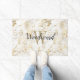 This chic, elegant design features a white and gold marble background. Personalise it with your monogram initial in gold coloured serif font and your family's name in charcoal grey calligraphy script.