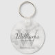 This keychain features personalised groomsman's name in grey classic script font style with wedding details in grey classic serif font style and monogram in light grey classic serif font style as background, on white marble background.
