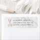Chic return address labels for hairstylists or hair salons feature a pair of stylist's shears in faux rose gold foil on a white marble background, alongside your return address details in elegant charcoal grey lettering.