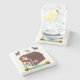 The coasters are gorgeous, a quality feel and heavy weight. They look like a precious archeological find. A rustic stone juxtaposed with a modern floral black and white print. I like the way the print goes slightly imperfect on the cut stone edges giving them a kind-of natural beauty.
