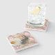 The coasters are gorgeous, a quality feel and heavy weight. They look like a precious archeological find. A rustic stone juxtaposed with a modern floral black and white print. I like the way the print goes slightly imperfect on the cut stone edges giving them a kind-of natural beauty.