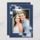 This beautiful wedding invitation is designed to go under a vellum overlay. It features a beautiful boho chic design with your photo on a marbled dusty navy blue background surrounded by a bounty of hand painted watercolor roses in shades of dusty blue, navy, and indigo. The back is a lush marbled blue colour with a cluster of the same flowers.
