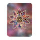 A pale but colourful fractal design like star clouds in outer space or multi-coloured marble with shades of pink, mauve, peach, and blue. The background is a mottled texture like a distant nebula, and the piece is accented by a gold-framed starburst medallion as if inlaid with gold filigree. Completing the picture are smooth opal-like jewels and faceted gemstones inset in a golden floret.