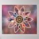 A pale but colourful fractal design like star clouds in outer space or multi-coloured marble with shades of pink, mauve, peach, and blue. The background is a mottled texture like a distant nebula, and the piece is accented by a gold-framed starburst medallion as if inlaid with gold filigree. Completing the picture are smooth opal-like jewels and faceted gemstones inset in a golden floret.