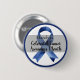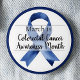 At the centre of the button, a bold dark blue awareness ribbon stands as a symbol of strength, hope, and advocacy in the fight against colourectal cancer.