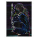 Photograph altered to a glowing outline abstract of a uniformed female marching band member in profile, holding her feathered hat in one hand and a clarinet in the other.