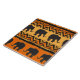 This is a unique decorative tile that features silhouette elephants in an African motif design. The black elephants march across fields of bright orange and gold, with geometric tribal symbols complementing the design.