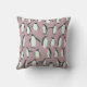 This cute pillow features a hand drawn black and white penguin pattern on a medium dusty fuchsia background. The penguin images are contrasted with light orange on the feet, head, and chest. They are shown in several positions, with a few scattered snowflakes falling among them. Definitely unique! Both sides of the pillow have the same image.