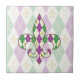 Bright purple and green diamonds overlaid with gold-toned diamond outlines and fleur de lis bring to mind the revelry and celebrations associated with a New Orleans Mardi Gras, while a cream base adds a touch of refinement to this argyle pattern. The pattern is masked behind the silhouette of a fleur de lis to add a fun final note.
