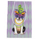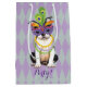 Cute Boston Terrier puppy, dressed in festive feather mask and beads, ready for fun on Mardi Gras or at any other time. Great to hold a gift for your Boston-loving family and friends who also love to have fun.