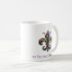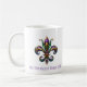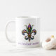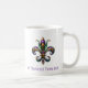 This ceramic coffee mug is shown with Mardi Gras images, Text of "Let the good times roll' is beneath the prints.