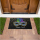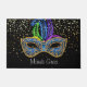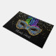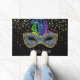 This doormat is shown with a Black coloured background with gold stars with a festive carnival Mardi Gras Mask print.