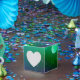 Bright purple and green background with shiny confetti. Festival Mardi Gras.