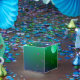 Bright purple and green background with shiny confetti. Festival Mardi Gras.