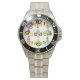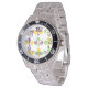This men's watch has a Mardi Gras design of fleur de lis lined across the design with different design in them.
