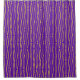 This shower curtain has a geometric Mardi Gras design of sort of flat-ended ovals repeating across the design in gold and green on a field of purple.