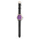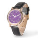 This women's watch has a geometric Mardi Gras design of sort of flat-ended ovals repeating across the design in gold and green on a field of purple.