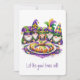 A group of gnomes, adorned in vibrant Mardi Gras costumes, happily gather around an enticing king cake, complete with beads.