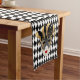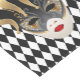 This table runner is shown with a black and white diamond pattern background print with a festive Mardi Gras festival mask print design.