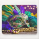 Mardi Gras sequin mask with gold necklace, feathers, and bokeh lighting