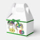 White gable-style favour box with an image, on the front, back and sides, of colourful Mardi Gras masks adorned with bright feathers and glitter. Green satin ribbon borders with green satin bows on the front and back. See the entire Mardi Gras Favour Box collection in the PARTY FAVORS section.