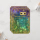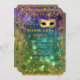 Want an elegant, festive Mardis Gras party invitation that is class and beautiful? This design, has a sparkling glitter look frame border and vintage style Gold embroidered, sequined mask (NOTE: this is a flat printed invitation there is no actual gold glitter or metallic foil or ink used) over a deep rich bokeh sparkle, twinkling lights background in deep, rich purple, blue, aqua and green. The reverse side is the matching shimmering lights background with the frame only. Easily change out your text using the template fields provided. Timeless, classic traditional style with a modern twist for a black tie elegance.