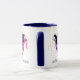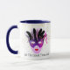 This combo deep Blue and white mug has an image of a Mardi Gras masks over petite golden-colour stars on a white background. Text of "Let the good times roll' is beneath the mask on Each side of the mug. Customise this item or buy as designed. Colours: deep blue handle and interior, white background, golden stars and a colourful print of purples, red and black masks.