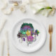 Set of eight 9” paper plates with a festive Mardi Gras image of a purple and green feathered headdress behind purple feathered masks, a fuchsia sequined hat, green and purple beads, purple, green and gold balloons, and two purple amethyst hearts. See matching candy jar, espresso cup, flask, mug, pitcher, shot glass, teapot and coasters. See the entire Mardi Gras Plate collection in the FOOD/BEV | Dishes section.
