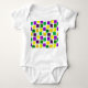 This baby bodysuit has a geometric design of squares in purple, yellow, and green scattered about with their outlines.