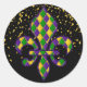 This small size round sticker is shown in a Mardi Gras celebration Fleur De Li print design.